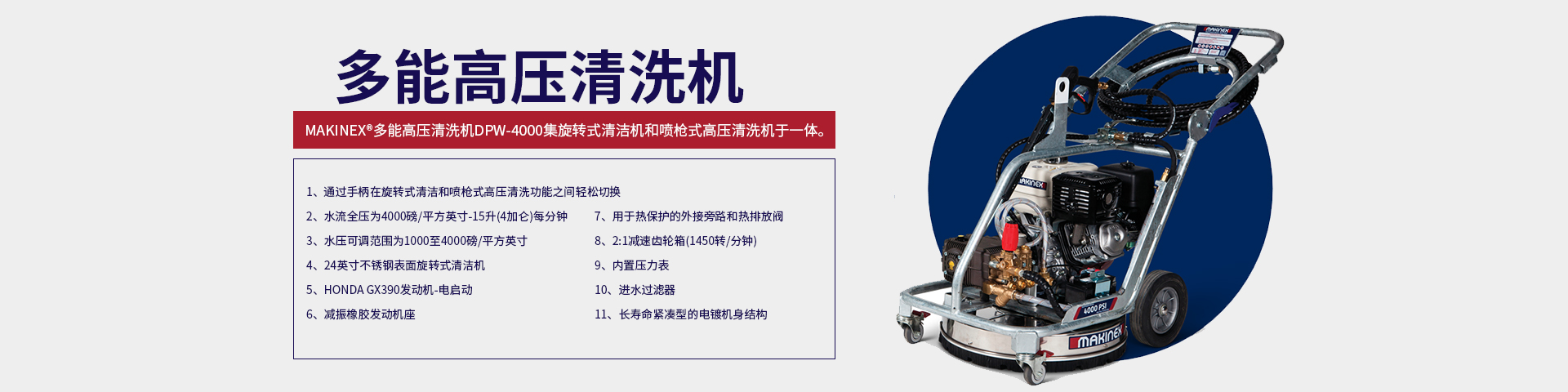 Makinex多能高壓清洗機DPW-4000具有無可比擬的多用性。雙清洗機功能和可調節的水壓使其完美適用于重型外部清潔應用…